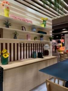 Plus loin, un espace café sous structure bois végétalisée (table Arki, tabourets Boni et Babila), puis un salon de détente avec la gamme Lou et les tables Chic & Choc dans des tons bordeaux et bleu venaient compléter l’ensemble.